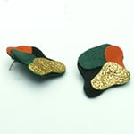 Black, orange, gold and green leather stud earrings on gold filled posts.